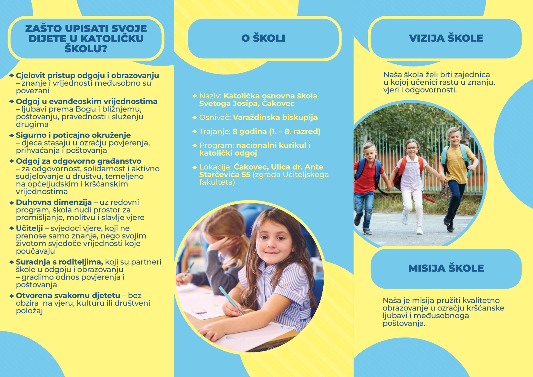 Želite li da vaše dijete uz redovno obrazovanje stasa u odgoju u katoličkoj vjeri, preporučujemo vam da ga upišete u Katoličku osnovnu školu.